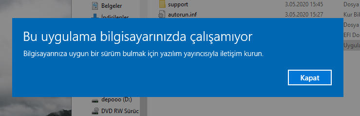 windows 64 bit yukleme yapmiyor