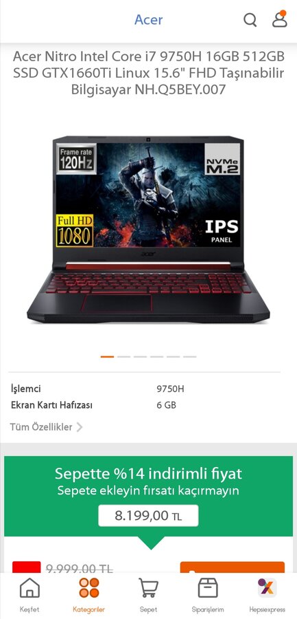 acer nitro 5 intel core i7 10750h 16gb 512gb ssd gtx1660ti freedos 15 6 fhd tasinabilir bilgisayar nh q7pey 002