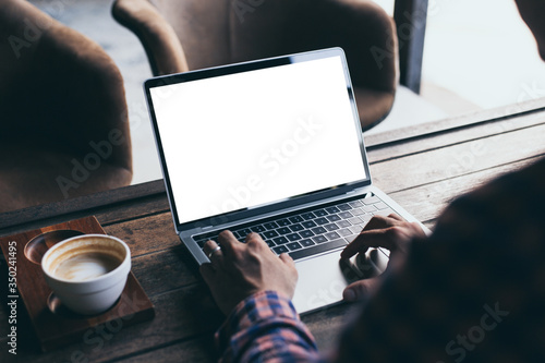 mockup image blank screen computer cell phone with white background for advertising text hand man using laptop texting mobile contact business search information on desk in cafe marketing design getzler henrich associates llc