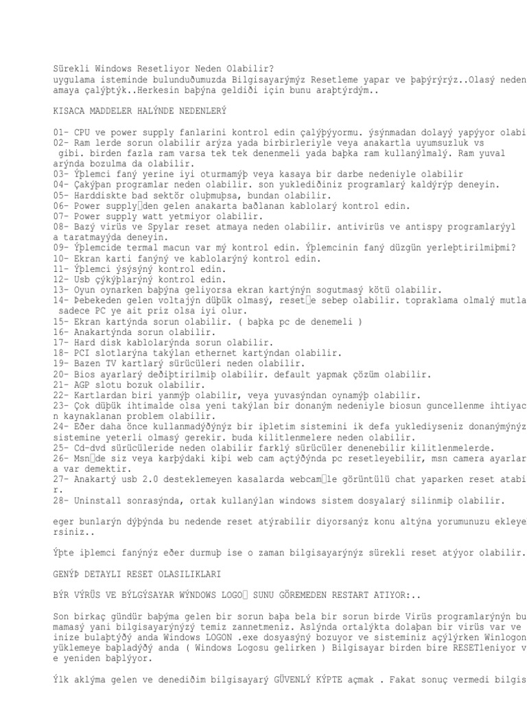 bilgisayarim reset atiyor diyen arkadaslar