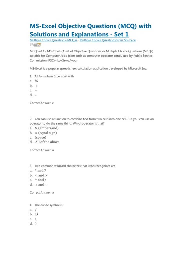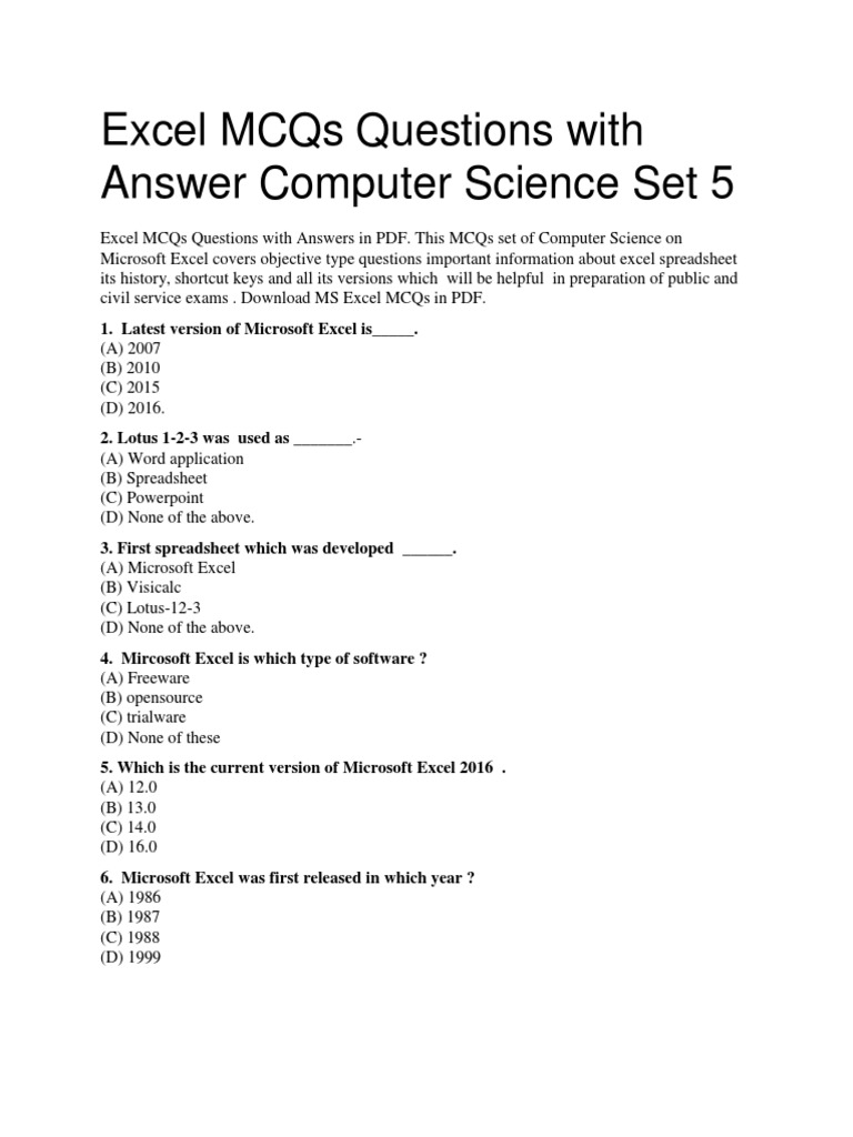 microsoft excel mcq questions with