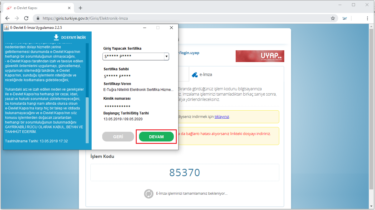 e devlet sistemine elektronik imza ve islem kodu ile giris