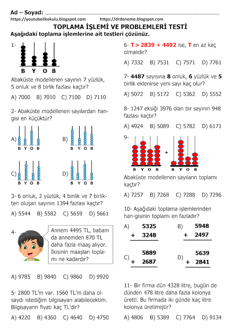 2 sinif online test toplama islemi