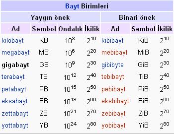 birimleri bit byte kb mb gb tb